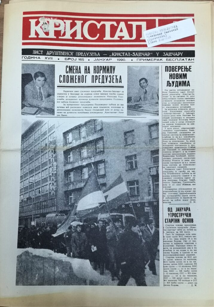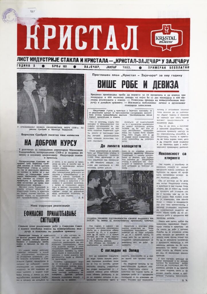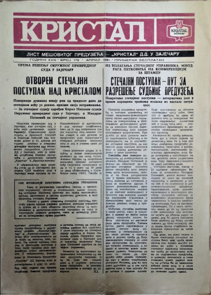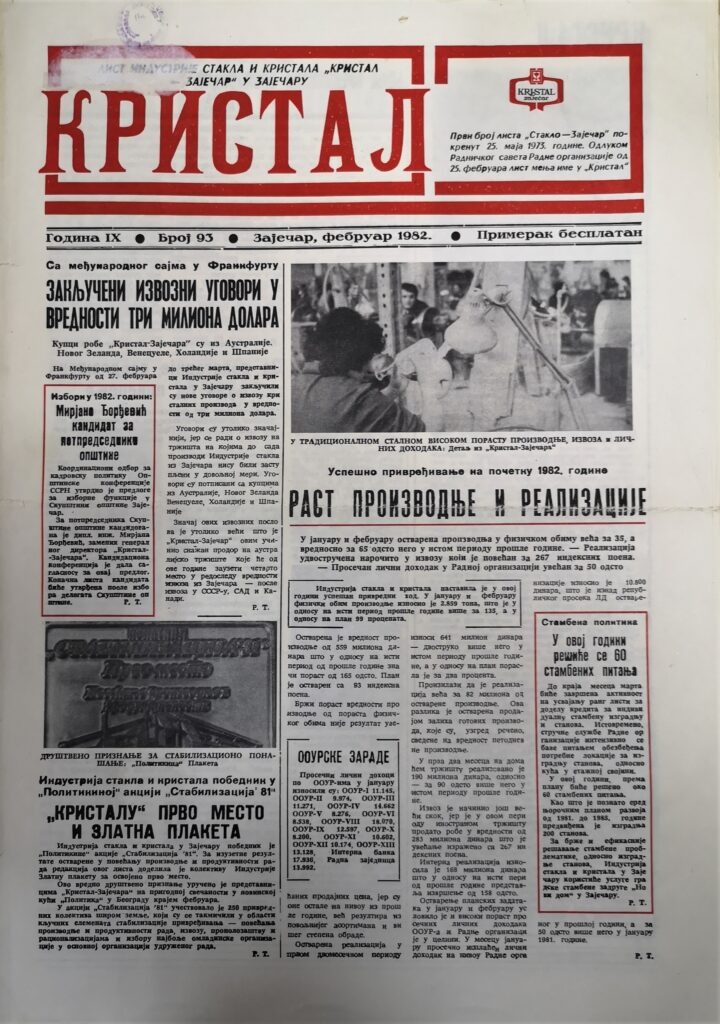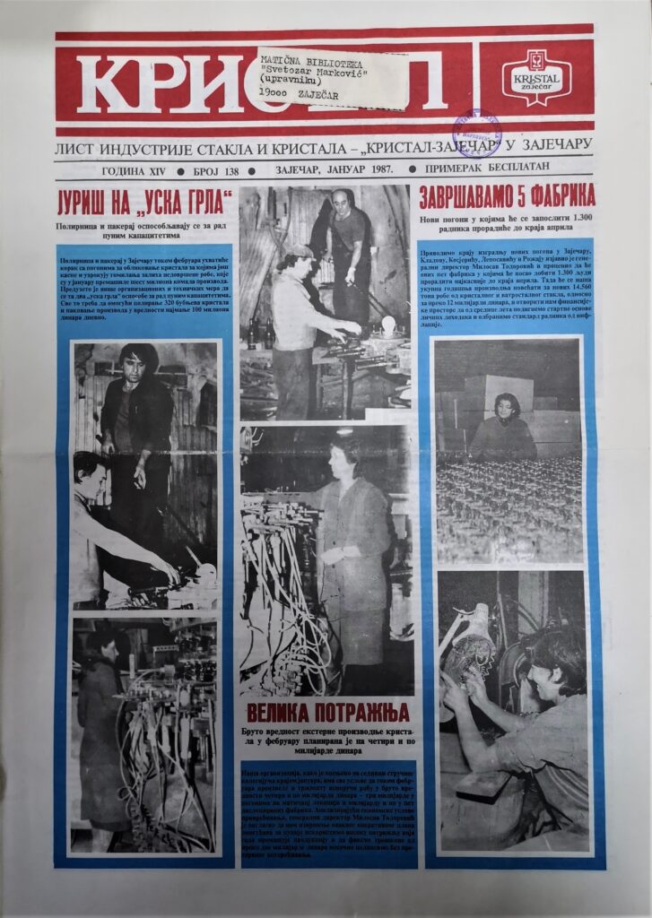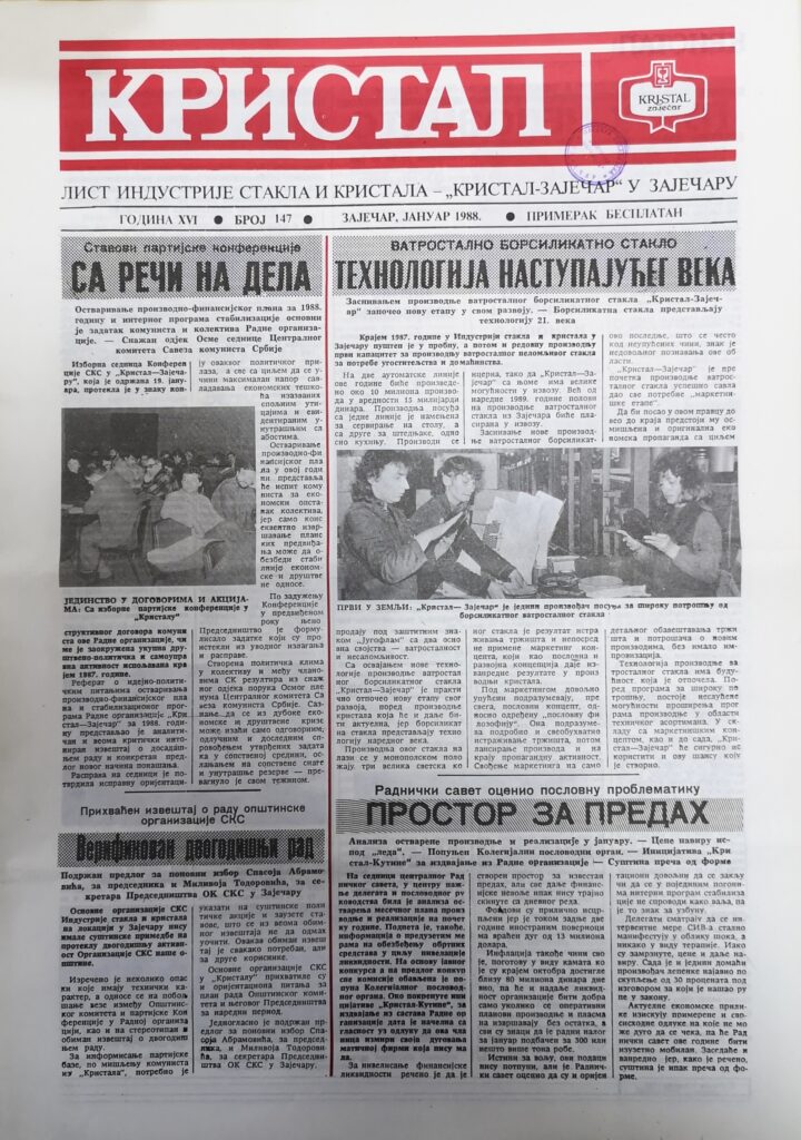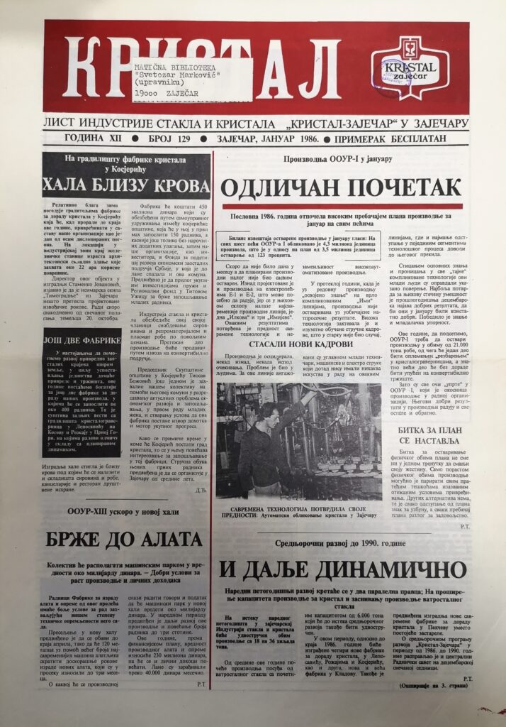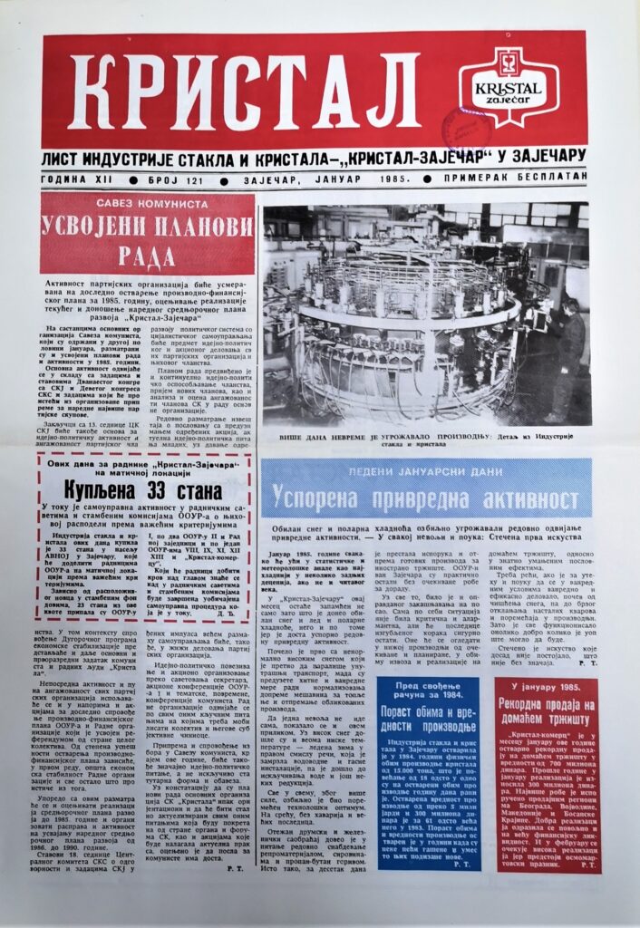 9. maja 1973. godine. Za glavnog i odgovornog urednika lista „Staklo Zaječar“ postavljen je Radosav Todorović. Prvi broj lista, štampan u Grafičkom preduzeću u Zaječaru u tiražu od 350 primeraka, pojavio se već 25. maja 1973. godine u dizajnu Aleksandra Portnoja. List je 1982. godine promenio ime u „Kristal Zaječar“ prateći promene u samoj fabrici.